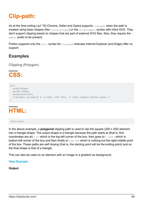 In the above example, a polygonal clipping path is used to clip the square (200 x 200) element