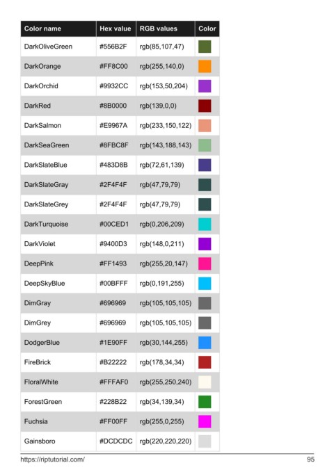 Color name Hex value RGB values Color