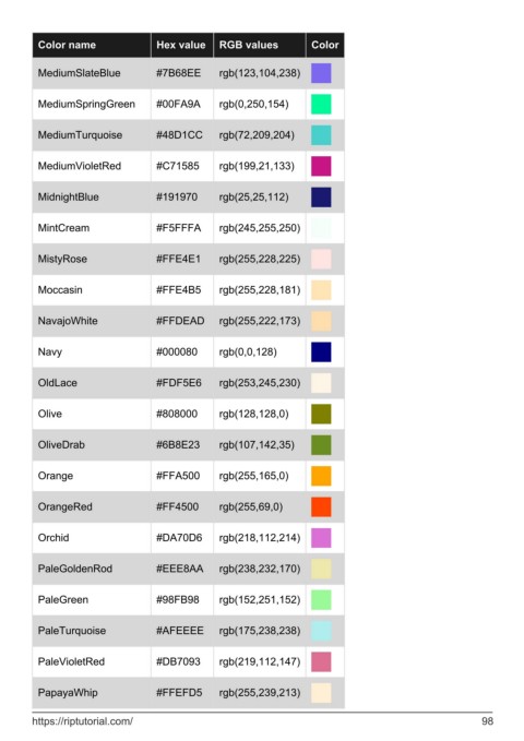 Color name Hex value RGB values Color