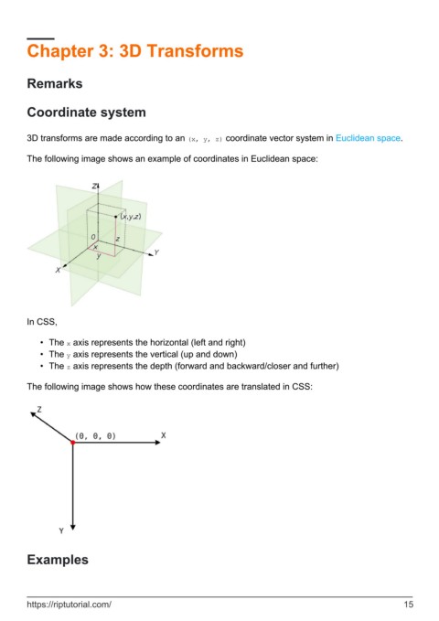 3D transforms are made according to an (x, y, z) coordinate vector system in Euclidean space.