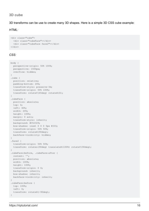 3D transforms can be use to create many 3D shapes. Here is a simple 3D CSS cube example: